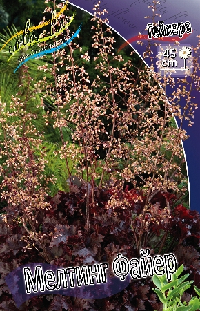 Гейхера Мелтинг Файер - листья пурпурно-красные, сильно рифленые. Цветки розовые. Цветущие растения производят впечатление праздничного фейерверка, придавая живописную легкость цветникам. Растение неприхотливо. Необходимый минимум условий при выращивании: глубокий дренаж, пятнистая тень, влагоемкая почва, обязательное окучивание один раз в год или через год.Характеристики
