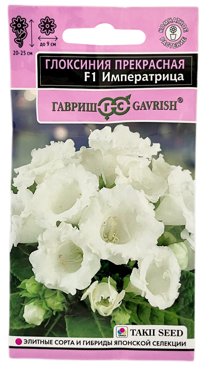 Глоксиния прекрасная Императрица F1 ГАВРИШРоскошное и очень модное среди цветоводов комнатное растение из семейства Геснериевые. Цветки колокольчатой формы, белые в синюю крапинку, с приятной бархатистой поверхностью венчают длинные цветоносы. Широкоовальные листья на коротких черешках украшают основание цветоноса. На взрослом растении образуется 10-15 крупных цветков, создавая впечатление нарядного букета. Глоксиния предпочитает светлые, солнечные места без воздействия прямых солнечных лучей. Идеальная температура для роста — 20-25°С днем и 18–22°С ночью. Во время цветения необходим обильный полив, еженедельные подкормки, влажный воздух (опрыскивание из пульверизатора). В октябре-ноябре, после цветения, полив и подкормку прекращают. Когда листья глоксинии засохнут, клубни вынимают из почвы и помещают на хранение в неглубокие ящички с чуть влажным песком или перлитом, которые устанавливают в помещении с температурой 10-12°С. После периода покоя (примерно 90 дней) клубни дадут новые ростки и их снова можно будет пересаживать в горшок. Семена на рассаду высевают поверх субстрата (не заделывая в почву) с февраля по март, накрывают стеклом и ставят в теплое, светлое место. Всходы появляются при температуре 22-24°С, через 10-14 дней. В фазе 3-х листьев растения пикируют, через месяц рассаживают в отдельные горшки. Зацветает глоксиния, выращенная из семян через 5-6 месяцев.