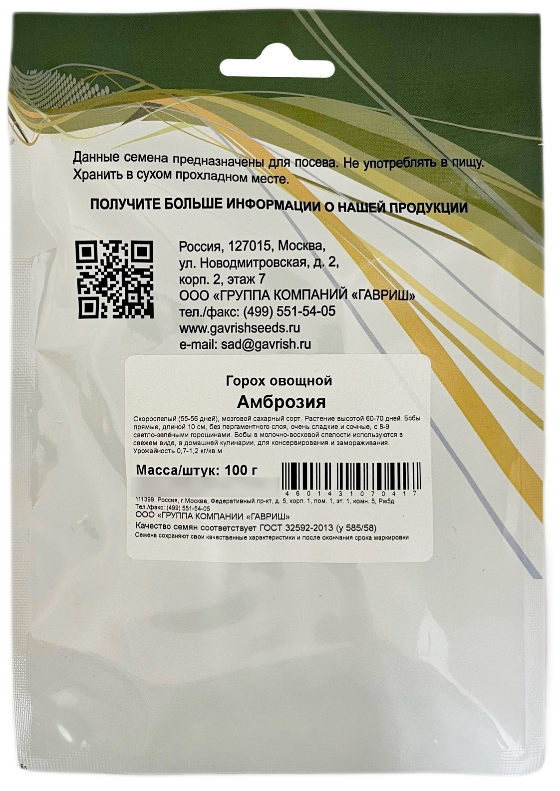Горох овощной АмброзияСкороспелый (55-56 дней), сахарный сорт. Растение высотой 60-70 дней. Бобы прямые, длиной 10 см, без пергаментного слоя, очень сладкие и сочные, с 8-9 светло-зелёными горошинами. Бобы в молочно-восковой спелости используются в свежем виде, в домашней кулинарии, для консервирования и замораживания. Урожайность 0,7-1,2 кг/кв.м.
