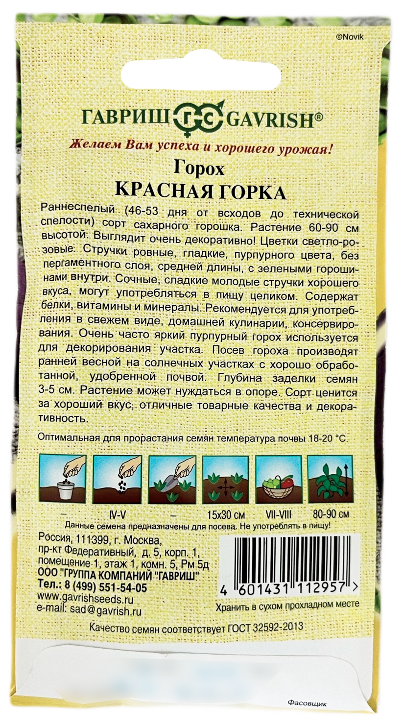 Горох Красная горкаРаннеспелый (46-53 дня от всходов до технической спелости) сорт сахарного горошка. Растение 60-90 см высотой. Выглядит очень декоративно! Цветки светло-розовые. Стручки ровные, гладкие пурпурного цвета, без пергаментного слоя, средней длины с зелеными горошинами внутри. Сочные, сладкие молодые стручки хорошего вкуса, могут употребляться в пищу целиком. Содержат белки, витамины и минералы. Рекомендуется для употребления в свежем виде, домашней кулинарии, консервировании. Очень часто яркий пурпурный горох используется для декорирования участка. Посев гороха производят ранней весной на солнечных участках с хорошо обработанной, удобренной почвой. Глубина заделки семян 3-5 см. Растение может нуждаются в опоре. Сорт ценится за хороший вкус, отличные товарные качества и декоративность.