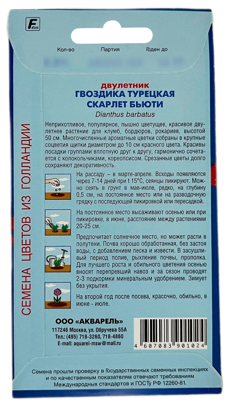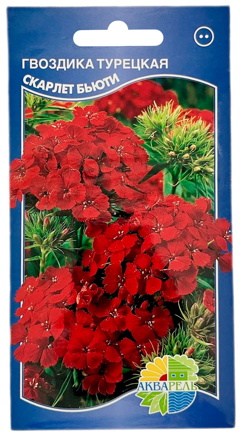Гвоздика турецкая СКАРЛЕТ БЬЮТИ АКВАРЕЛЬПышно цветущее, красивое двулетнее растение для клумб, бордюров, рокариев. Высотой 50 см. Многочисленные цветки собраны в крупные (10-11 см) щитковидные соцветия красного цвета. Обычно сажают отдельно от других растений, красивы посадки группами вплотную друг к другу, но и замечательно сочетается с лобелией, гипсофилой. Срезанные цветы долго сохраняют свою свежесть.