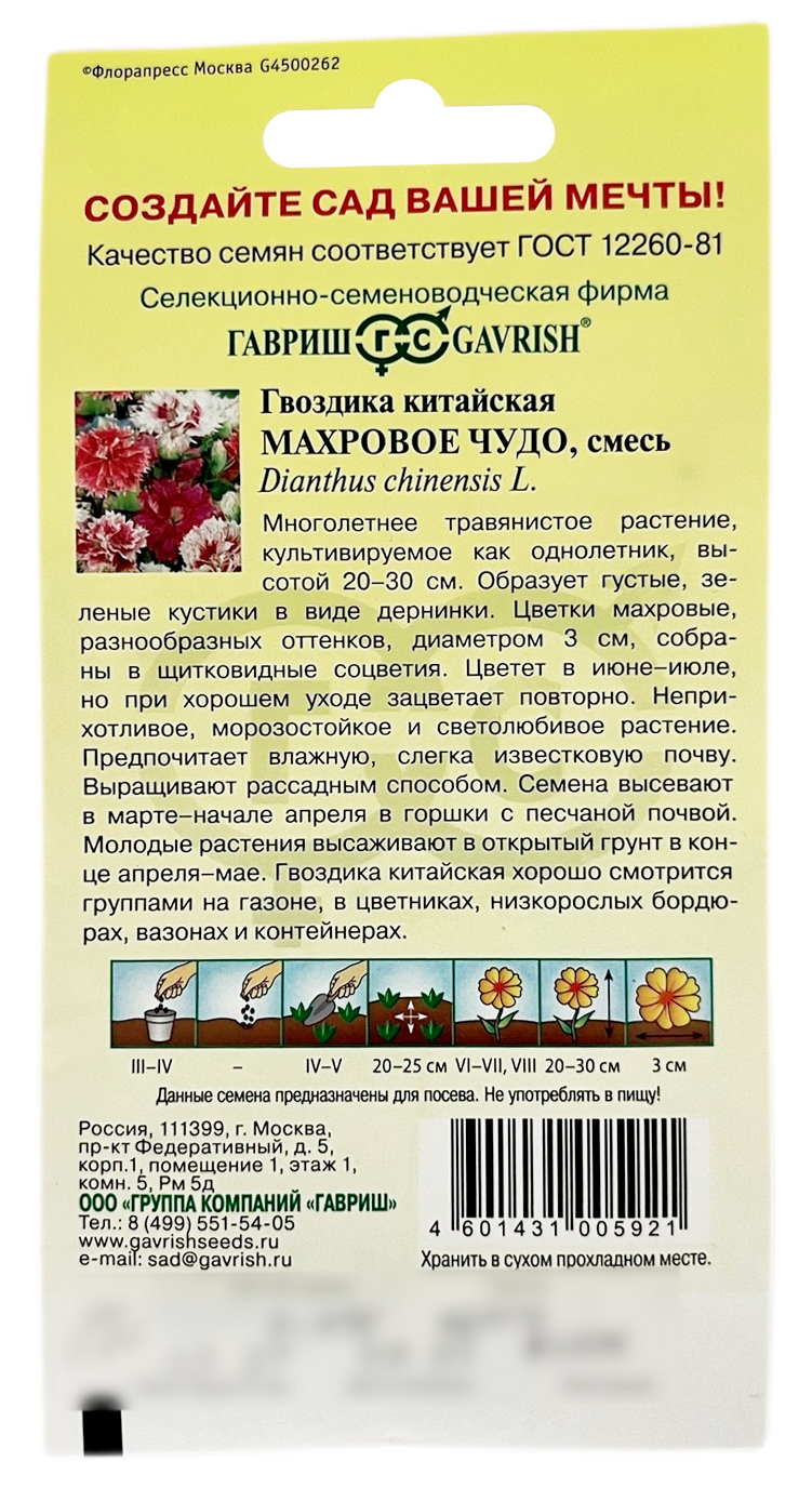 Гвоздика китайская МАХРОВОЕ ЧУДО смесь ГАВРИШТравянистое растение семейства Гвоздичные, с ползучими стеблями. В высоту достигает до 20-30 см. Цветет с июня до октября красивыми белыми, розовыми или красными цветками с гофрированными по краю лепестками. Малотребовательна, морозостойка, светолюбива. Одинаково хорошо развивается и на ярком солнце, и в легкой полутени, предпочитая влажную, слегка известковую почву. Семена высевают в марте на рассаду, а после заморозков — в открытый грунт.