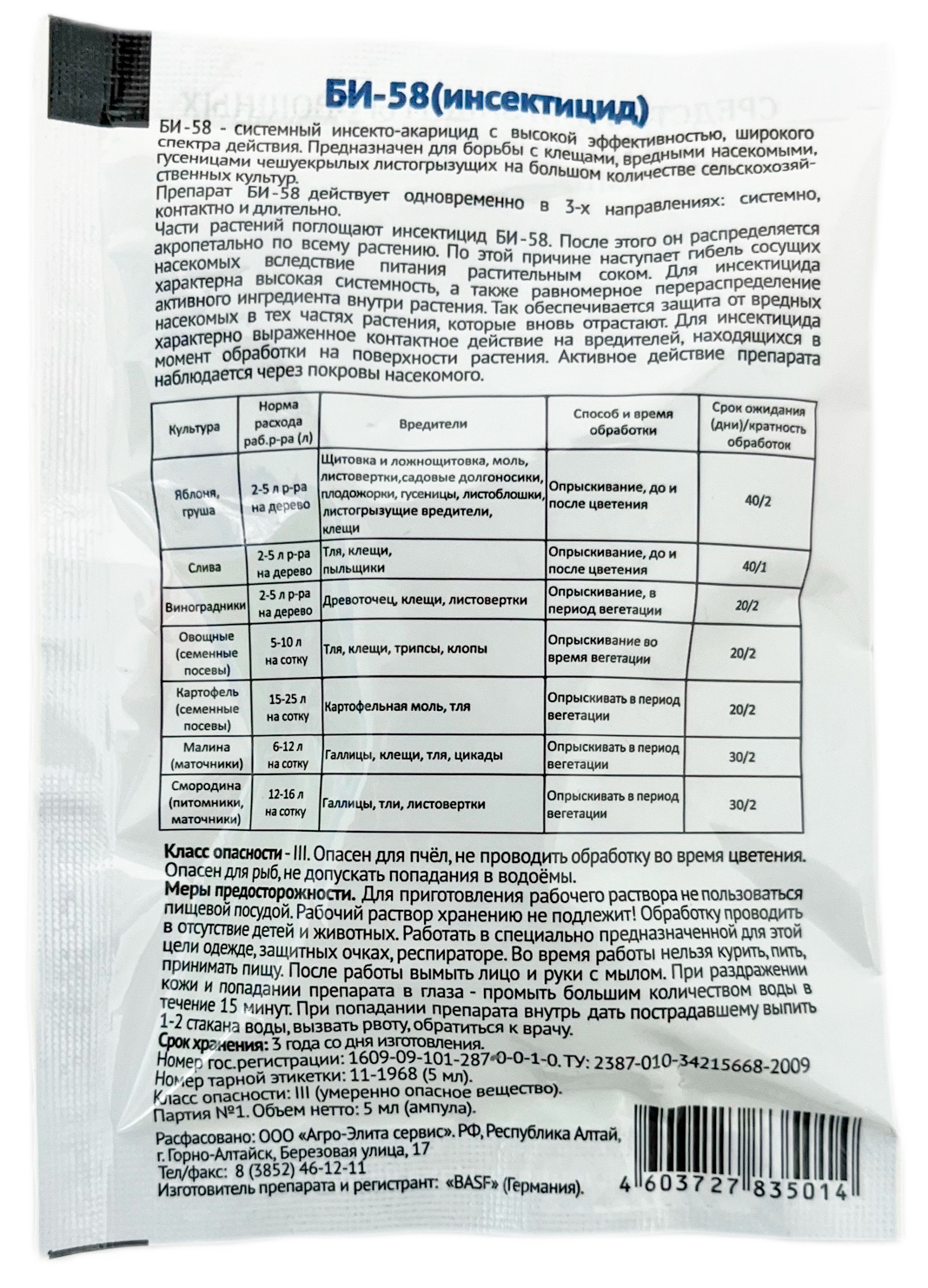 Би-58 5млБи-58 (ампула в пакете) - препарат для борьбы с насекомыми, гусеницами, бабочками, клещами и другими садовыми вредителями.