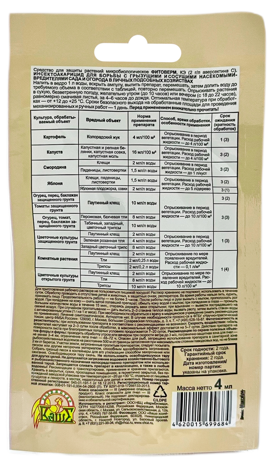 Средство для защиты растений от вредителей "Фитоверм", 4 мл.«Фитоверм» имеет широкий спектр действия: против более 20 видов насекомых вредителей, в том числе колорадского жука, капустной белянки, капустной совки, паутинного клеща, яблонной плодожорки, цветоедов, трипсов, всех видов тли.