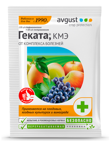 Геката - комбинированный препарат от комплекса болезней на плодовых, ягодных культурах и винограде. Инфекции сада, гнили портят плоды, сокращают срок хранения, снижают урожайность и могут даже привести к гибели растения. Зараженные яблоки и груши выделяют токсины, вредные для человека. Геката содержит уникальное сочетание действующих веществ, что позволяет эффективно лечить и защищать от болезней, не вызывая привыкания у возбудителей инфекции.От парши и мучнистой росы первое опрыскивание, профилактическое, проводят в стадии "зеленый конус", когда из почки только показался зеленый кончик листа. Препарат обладает системными свойствами - равномерно распределяется внутри ткани растения, защищая в дальнейшем молодую поросль. Необходимо провести 3 обработки с интервалом 7-14 дней.