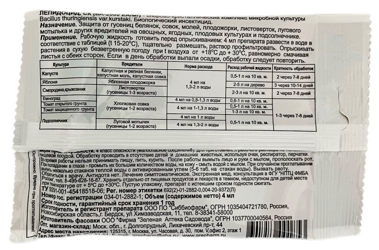 Средство для защиты садовых растений от вредителей «Лепидоцид» 4 млБезопасная для человеческого организма альтернатива химическим средствам, предназначенным для борьбы с садовыми вредителями. Используется для обработки сельскохозяйственных, лесных и парковых культур для защиты от гусениц чешуекрылых насекомых. Биопрепарат выпускается в форме порошка. Для достижения максимального эффекта перед обработкой порошок следует развести в воде в пропорции 1:200 (на 5 мл препарата требуется 1 л жидкости). Готовым раствором рекомендуется обработать растения с началом появления гусениц.