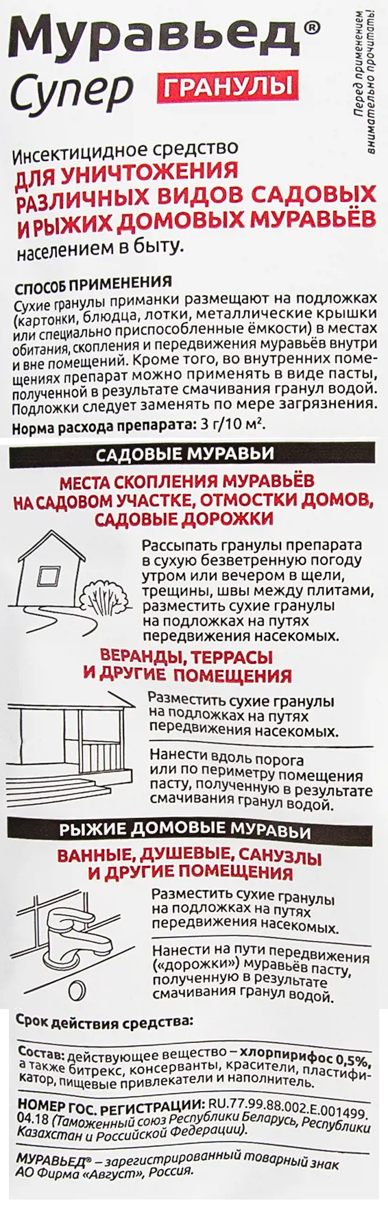 Использовать Муравьед Супер очень просто: чтобы избавиться от домовых муравьёв, гранулы раскладывают на подложках в местах передвижения насекомых. Если слегка смочить гранулы водой, получится паста, которую можно наносить вдоль порогов и по плинтусам помещений. 3 г препарата достаточно для обработки 10 м².