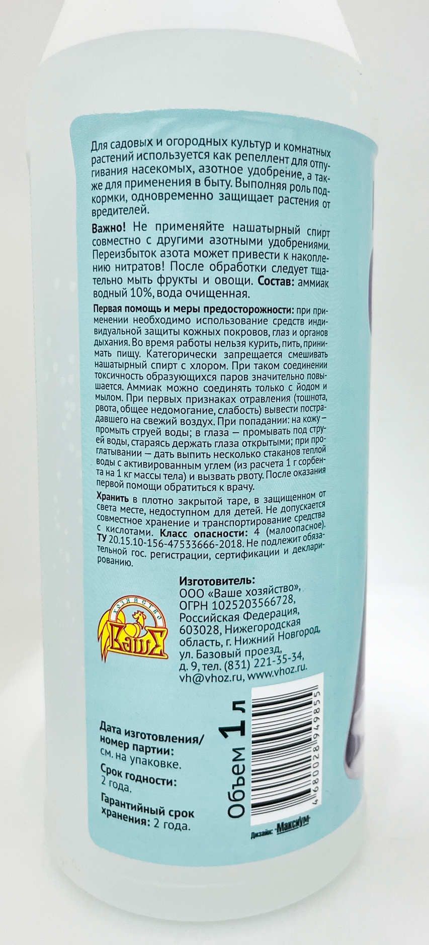 Нашатырный спирт садовый 10% 1лСостав: аммиак водный 10%, вода очищенная.