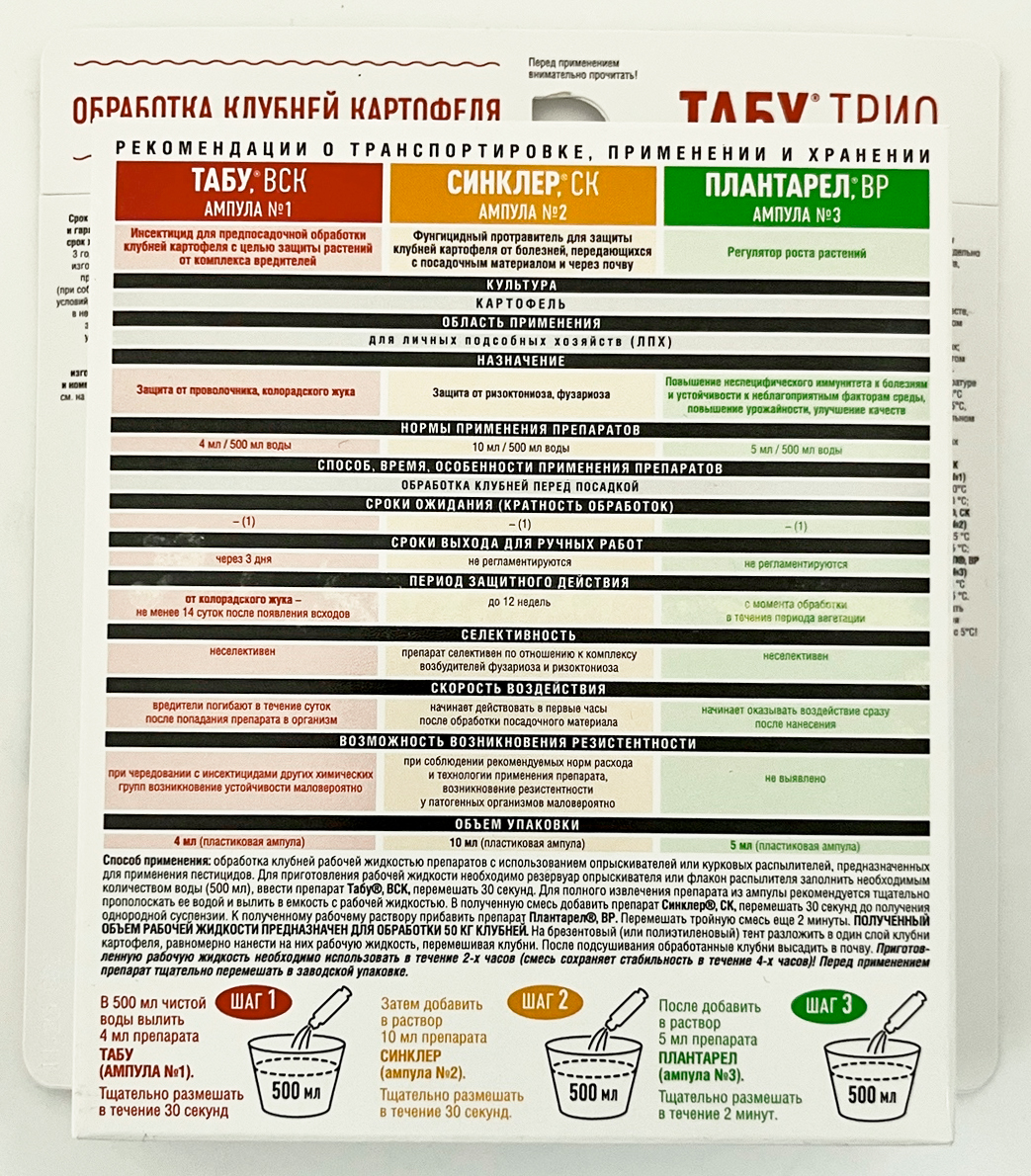 Табу® ТРИО - комплексная защита картофеля от болезней, колорадского жука, проволочника и погодных стрессов.- Используется в виде баковой смеси из трёх препаратов;