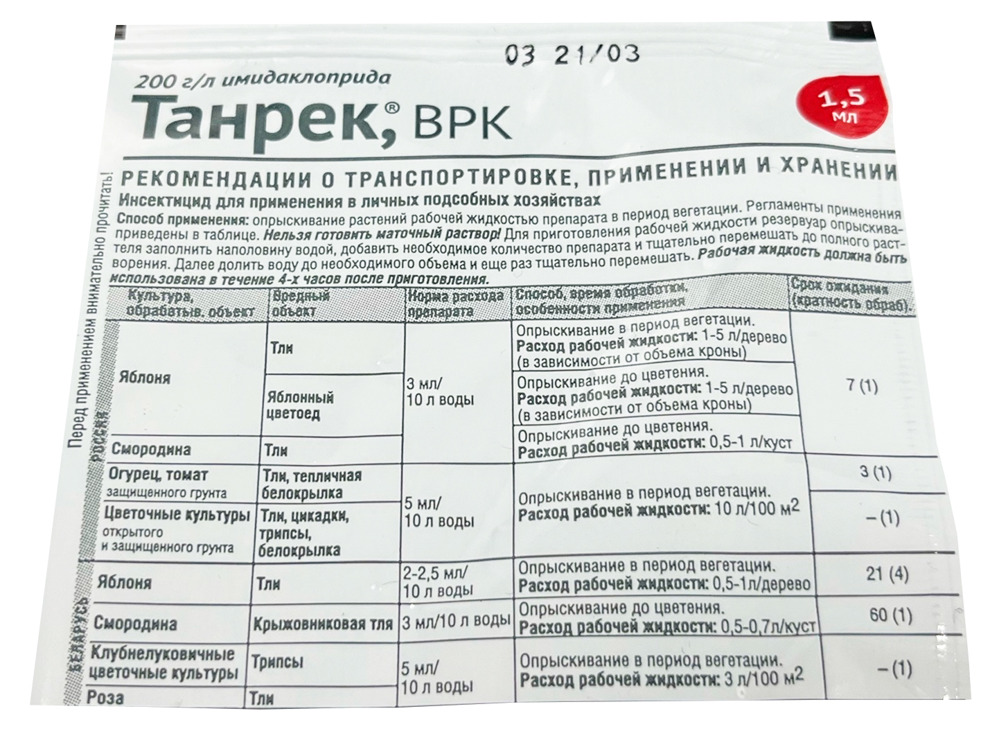 Танрек - это средство от тли с длительным периодом защитного действия, рассчитанным на уничтожение тли на овощных, плодовых, ягодных и цветочно-декоративных культурах.Танрек эффективен благодаря двум механизмам действия (вредитель погибает при непосредственном контакте с раствором препарата и при питании соком обработанных растений). Также не вызывает привыкания у вредителей. Благодаря своей уникальной способности быстро проникать в листья растений, Танрек от тли достигает точно тех мест, где питается вредитель. Поэтому он уничтожает даже красносмородинную тлю, которая питается соком растений с обратной стороны листа и из-за этого труднодоступна при обработке. Танреку от тли не страшны внешние воздействия: ни жара, ни холод, ни дожди. Быстро проникая в ткани растений, он действует в короткие сроки целенаправленно и эффективно. Всего одна обработка Танреком от тли защитит растения от комплекса вредителей на весь сезон!