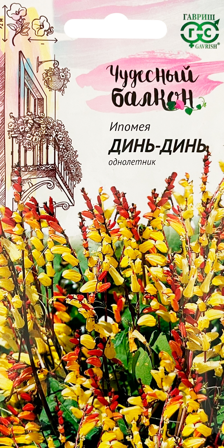 Ипомея Динь-ДиньЭта необычная лиана притягивает взоры своим ярким убранством и экзотичностью и служит достойным растением для вертикально декорирования балконов. На фоне темно-зеленых лопастных листьев словно всполохи яркого пламени «,светятся», оригинальные соцветия. Красота ипомеи в том, что одновременно на растении присуствуют начинающие цвести и доцветающие соцветия. Постепенная смена окраски от красно-желтых до белеющих трубчатых цветков воспринимается словно игра огня. Растение высотой более 2 м, имеет многочисленные побеги. Цветет с конца июля до заморозков. Ипомея теплолюбива, предпочитает солнечные места и дренированную почву. Семена на рассаду высевают в феврале-марте. Подросшие растения высаживают в открытый грунт во второй половине мае на расстоянии 30 см.
