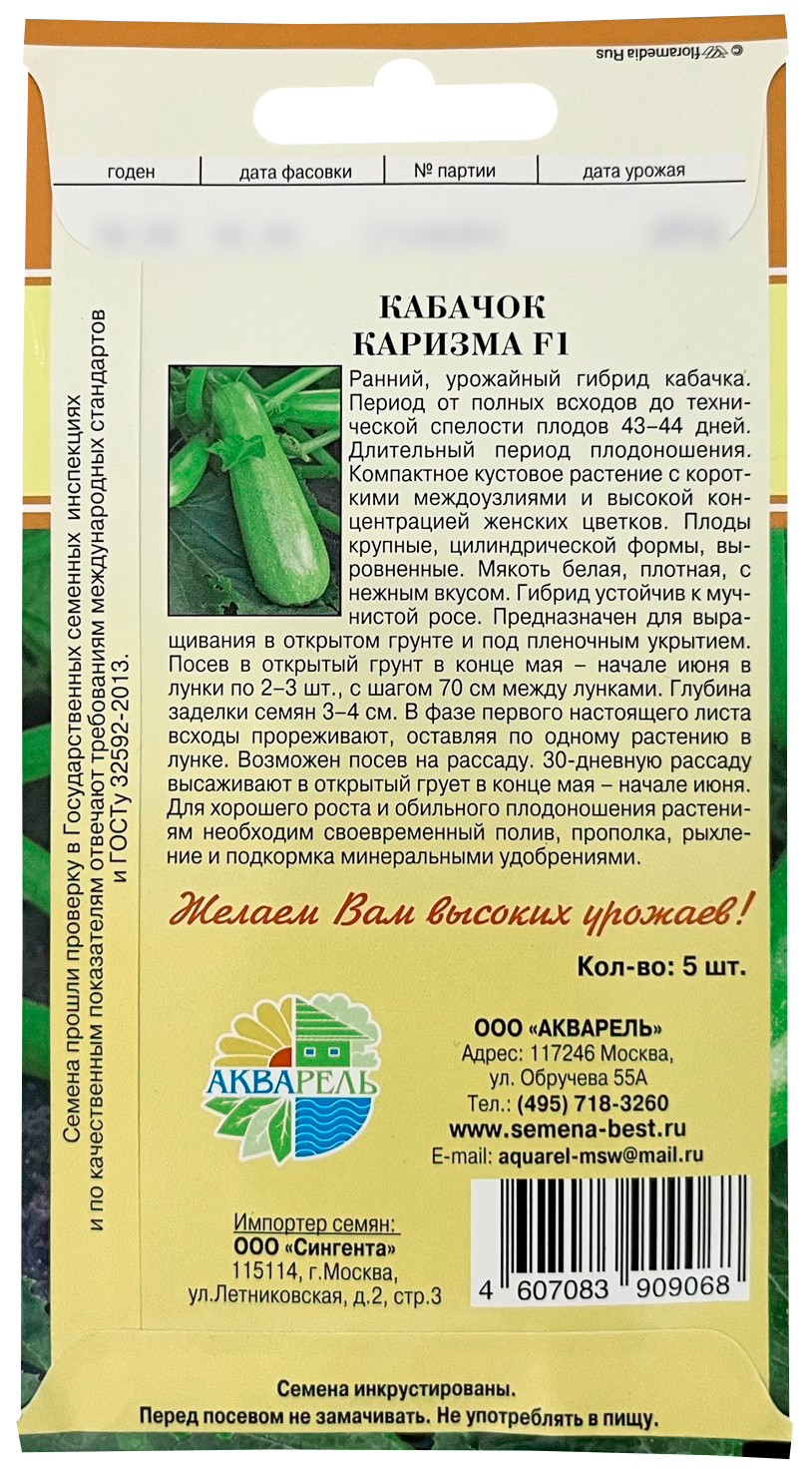 Кабачок Каризма F1 АКВАРЕЛЬРанний, урожайный гибрид кабачка. Период от полных всходов до технической спелости плодов 43-44 дней. Длительный период плодоношения. Компактное кустовое растение с короткими междоузлиями и высокой концентрацией женских цветков. Плоды крупные, цилиндрической формы, выровненные. Мякоть белая, плотная, с нежным вкусом. Гибрид устойчив к мучнистой росе. Предназначен для выращивания в открытом грунте и под пленочным укрытием. Посев в открытый грунт в конце мая - начале июня в лунки по 2-3 шт., с шагом 70 см между лунками. Глубина заделки семян 3-4 см. В фазе первого настоящего листа всходы прореживают, оставляя по одному растению в лунке. Возможен посев на рассаду. 30-дневную рассаду высаживают в открытый грунт в конце мая – начале июня. Для хорошего роста и обильного плодоношения растениям необходим своевременный полив, прополка, рыхление и подкормка минеральными удобрениями.