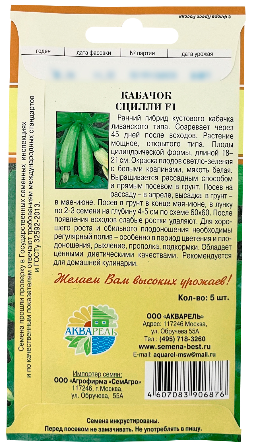 Кабачок Сцилли F1 АКВАРЕЛЬСцилли F1 PS - ранний, продуктивный гибрид кабачка Ливанского типа. Созревает через 45 дней после всходов. Растение мощное, открытого типа. Плоды кабачка Сцилли F1 PS цилиндрической формы, длиной 18-21см, светло-зеленые с белыми вкраплениями. Очень дружная отдача урожая (нет необходимости в ежедневном сборе). Один из немногих гибридов, имеющих промежуточную устойчивость к вирусу желтой мозаики цуккини (ZYMV) и вирусу мозаики арбуза (WMV). Рекомендуется для весенней, летней и осенней культуры в открытом грунте и под временными пленочными укрытиями.
