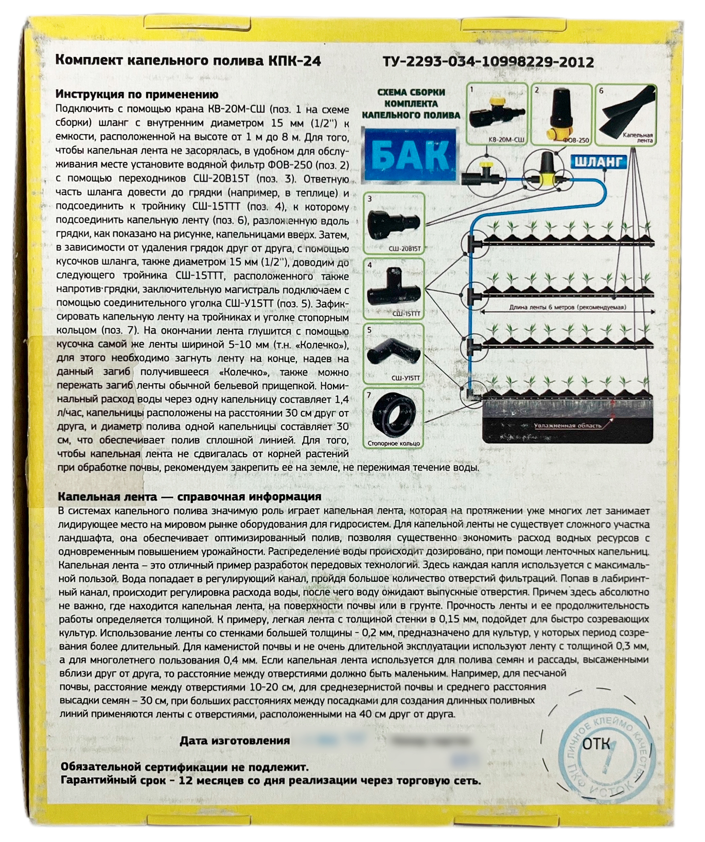 Комплект капельного полива КПК-24Предназначен для полива грядок на садово-огородных участках в открытом грунте и теплицах из накопительных емкостей для воды с условным давлением от 0,2-0,8 атм. Обеспечивает равномерный полив прикорневой области растений, экономит воду, создает максимально комфортные условия развития семян, рассады и взрослых растений.
