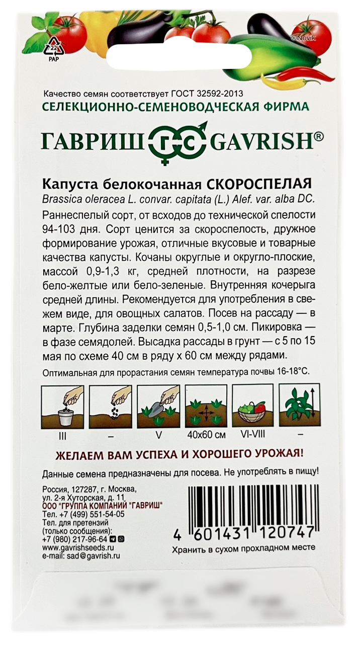 Капуста белокочанная СКОРОСПЕЛАЯ ГАВРИШРаннеспелый сорт от всходов до технической спелости 94-103 дня. Сорт ценится за скороспелость, дружное формирование урожая, отличные вкусовые и товарные качества капусты. Кочаны округлые и округло-плоские, массой 0,9-1,3 кг, средней плотности, на разрезе бело-желтые или бело-зеленые. Внутренняя кочерыга средней длины. Рекомендуется для употребления в свежем виде, овощных салатов. Посев на рассаду — в марте. Глубина заделки семян 0,5-1,0 см. Пикировка — в фазе семядолей. Высадка рассады в грунт с 5 по 15 мая по схеме 40х60.