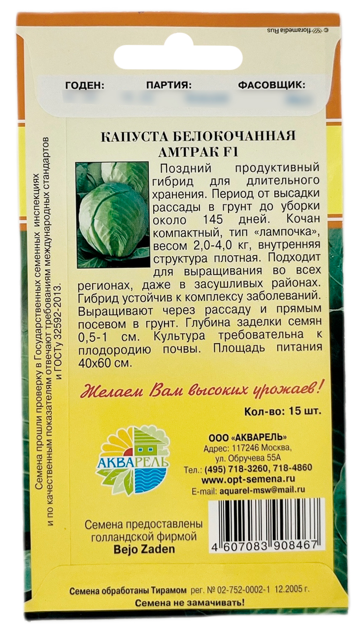 Капуста белокочанная Амтрак F1Поздний продуктивный гибрид для длительного хранения. Период от высадки рассады в грунт до уборки около 145 дней. Кочан компактный, тип «лампочка», весом 2,0-4,0 кг, внутренняя структура плотная. Подходит для выращивания во всех регионах, даже в засушливых районах. Гибрид устойчив к комплексу заболеваний. Выращивают через рассаду и прямым посевом в грунт. Глубина заделки семян 0,5-1 см. Культура требовательна к плодородию почвы. Площадь питания 40x60 см.