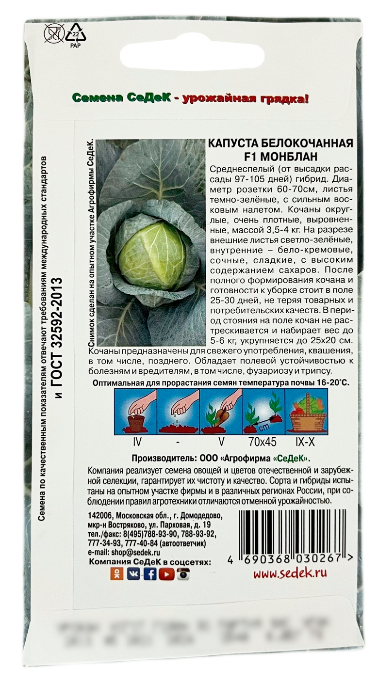 Капуста белокочанная МОНБЛАН СеДеКСреднеспелый (115-120 дней) гибрид. Розетка листьев раскидистая. Лист сизо-зеленый с восковым налетом. Кочаны округлые, на разрезе бело-кремовые, с короткой внутренней кочерыгой, массой 4-5 кг, плотные, сочные, отличного вкуса. Урожайность 5,0-6,0кг/м2. Ценность гибрида: устойчивость к фузарионому увяданию, выравненность кочанов, пригодность для непродолжительного хранения. Предназначен для свежего употребления, квашения, переработки.