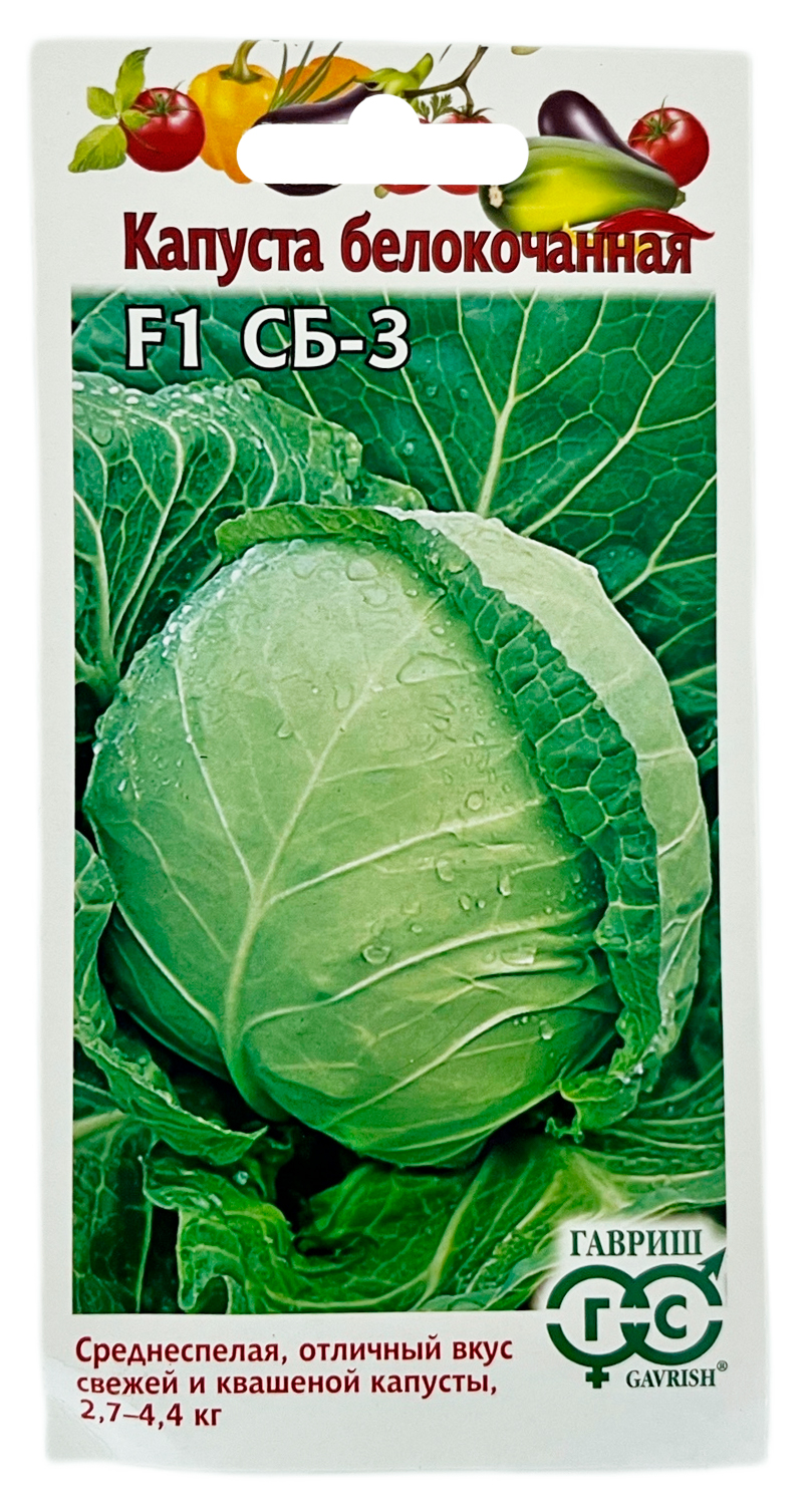 Капуста белокочанная СБ 3 ГАВРИШСреднеспелый (110-120 дней от всходов до технической спелости) гибрид. Посев на рассаду в апреле. Пикировка-в фазе семядолей. Высадка в грунт в мае по схеме 60х50 см. Розетка листьев крупная. Кочан округлый, массой 2,7-4,4 кг, высокой плотности. Наружная окраска светло-зеленая, на разрезе бело-зеленая. Гибрид характеризуется высокой урожайностью, дружным созреванием и выравненностью кочанов. Вкусовые качества свежей и квашеной капусты высокие. Устойчив к возбудителям основных болезней капусты. Рекомендован для употребления в свежем виде и для квашения. Урожайность до 10-12 кг/м2.
