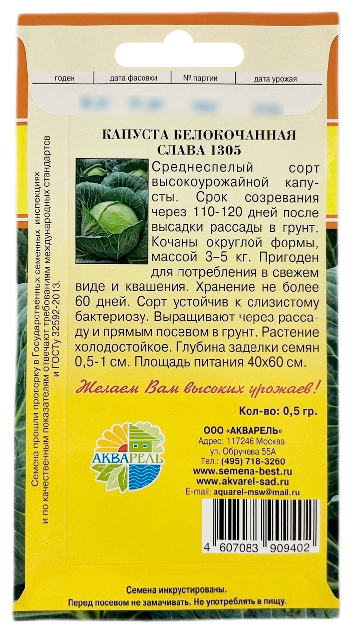 Капуста белокочанная СЛАВА 1305 F1 АКВАРЕЛЬСреднеспелый сорт высокоурожайной капусты. Срок созревания через 110-120 дней после высадки рассады в грунт. Кочаны округлой формы, массой 3–5 кг. Пригоден для потребления в свежем виде и квашения. Хранение не более 60 дней. Сорт устойчив к слизистому бактериозу. Выращивают через рассаду и прямым посевом в грунт. Растение холодостойкое. Глубина заделки семян 0,5-1 см. Площадь питания 40х60 см.