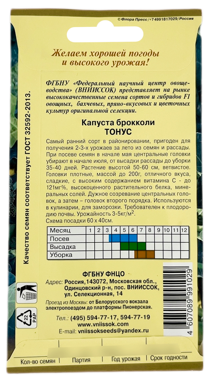 Капуста брокколи ТОНУС ВНИИССОКТонус - ультраскороспелый сорт, дружно созревающий через 35-40 суток после высадки рассады. Головки плотные, массой 160-200 г. Через 5-8 суток после появления центральной головки в пазухах листьев формируются головки второго порядка.