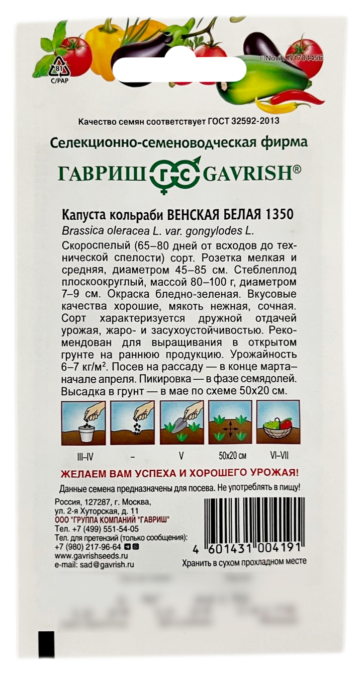 Капуста кольраби ВЕНСКАЯ БЕЛАЯ 1350 ГАВРИШСкороспелый (65-80 дней от всходов до технической спелости) сорт. Посев на рассаду в конце марта - начале апреля. Пикировка в фазе семядолей. Высадка в грунт в мае по схеме 50х20см. Розетка мелкая и средняя, диаметром 45-85 см. Плод плоскоокруглый, массой 80-100 г, диаметром 7-9 см. Окраска бледно-зеленая Вкусовые качества хорошие, мякоть нежная, сочная. Сорт характеризуется дружной отдачей урожая, жаро- и засухоустойчивостью. Рекомендован для выращивания в открытом грунте на раннюю продукцию. Урожайность 6,0-7,0 кг/м2.