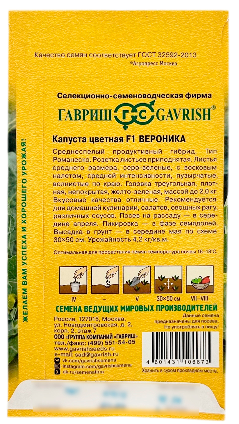 Капуста цветная ВЕРОНИКА F1 ГАВРИШСреднеспелый продуктивный гибрид. Тип Романеско. Розетка листьев приподнятая. Листья среднего размера, серо-зеленые, с восковым налетом, средней интенсивности, пузырчатые, волнистые по краю. Головка треугольная, плотная, непокрытая, желто-зеленая, массой до 2,0 кг. Вкусовые качества отличные. Рекомендуется для домашней кулинарии, салатов, овощных рагу, различных соусов. Посев на рассаду — в середине апреля. Пикировка — в фазе семядолей. Высадка в грунт — в середине мая по схеме 30х50 см. Урожайность до 4,2 кг/м2.