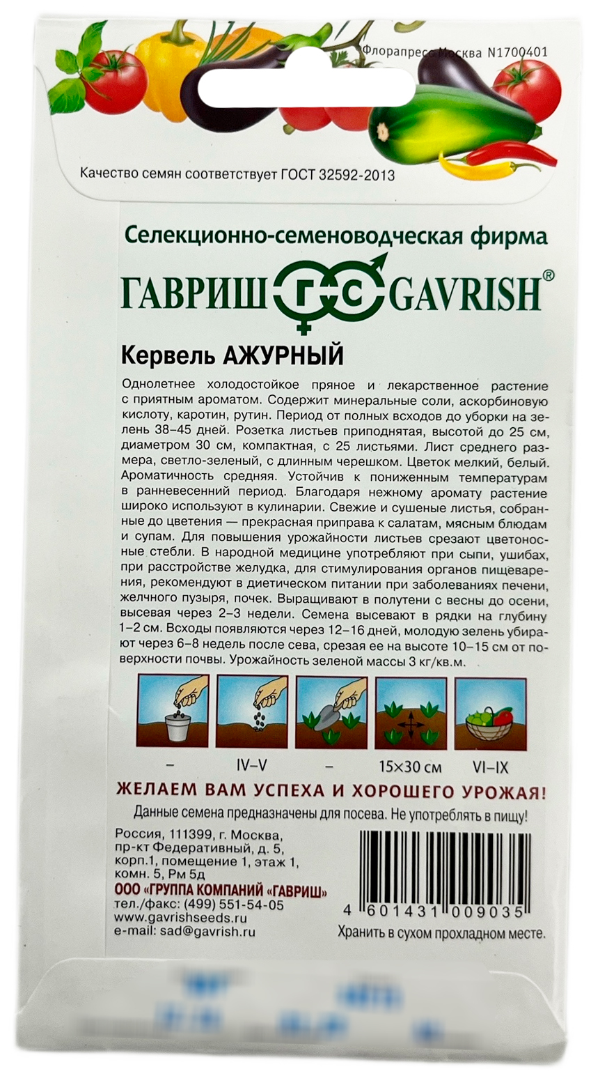 Кервель Ажурный ГАВРИШОднолетнее холодостойкое пряное и лекарственное растение с приятным ароматом. Содержит минеральные соли, аскорбиновую кислоту, каротин, рутин. Период от полных всходов до уборки на зелень 38-45 дней. Розетка листьев приподнятая, диаметром 30 см, компактная, с 25 листьями. Лист среднего размера, светло-зеленый, троякоперисто-рассеченный, гладкий, с длинным черешком. Цветок мелкий, белый. Устойчив к пониженным температурам в ранне-весенний период. Выращивают в полутени с весны до осени, высевая через 2 - 3 недели. Семена высевают в рядки на глубину 1-2 см. Всходы появляются через 12-16 дней, молодую зелень убирают через шесть - восемь недель после сева, срезая ее на высоте 10-15 см от поверхности почвы. Свежие и сушеные листья, собранные до цветения, - прекрасная приправа к салатам, мясным блюдам и супам. Для повышения урожайности листьев срезают цветоносные стебли. В народной медицине употребляют при сыпи, ушибах, при расстройстве желудка, для стимулирования органов пищеварения, рекомендуют в диетическом питании при заболеваниях печени, желчного пузыря, почек.Урожайность зеленой массы 3 кг/ м2.