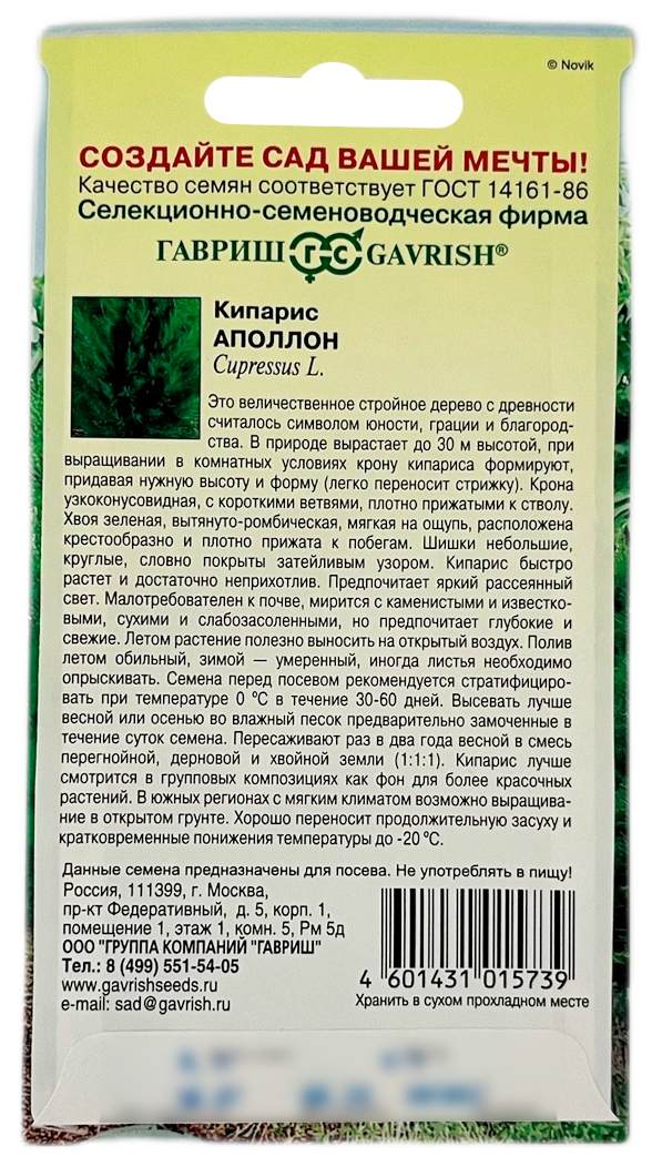 Кипарис АПОЛЛОН ГАВРИШЭто величественное, стройное дерево с древности считалось символом юности, грации и благородства. Вырастая до 30 м высотой, кипарис имеет узкоконусовидную крону с короткими восходящими ветвями, плотно прижатыми к стволу. Хвоя зеленая, мелкая, вытянуто-ромбической формы, мягкая на ощупь , расположена крестообразно и плотно прижата к побегам. Шишки небольшие, круглые, словно покрытые затейливым узором. Семена красно-бурые, с узким крылом, до 20 см под каждой чешуей. Растет довольно быстро, особенно в молодости . Теневынослив. Хорошо переносит продолжительную засуху и кратковременные понижения температуры до -20 С.