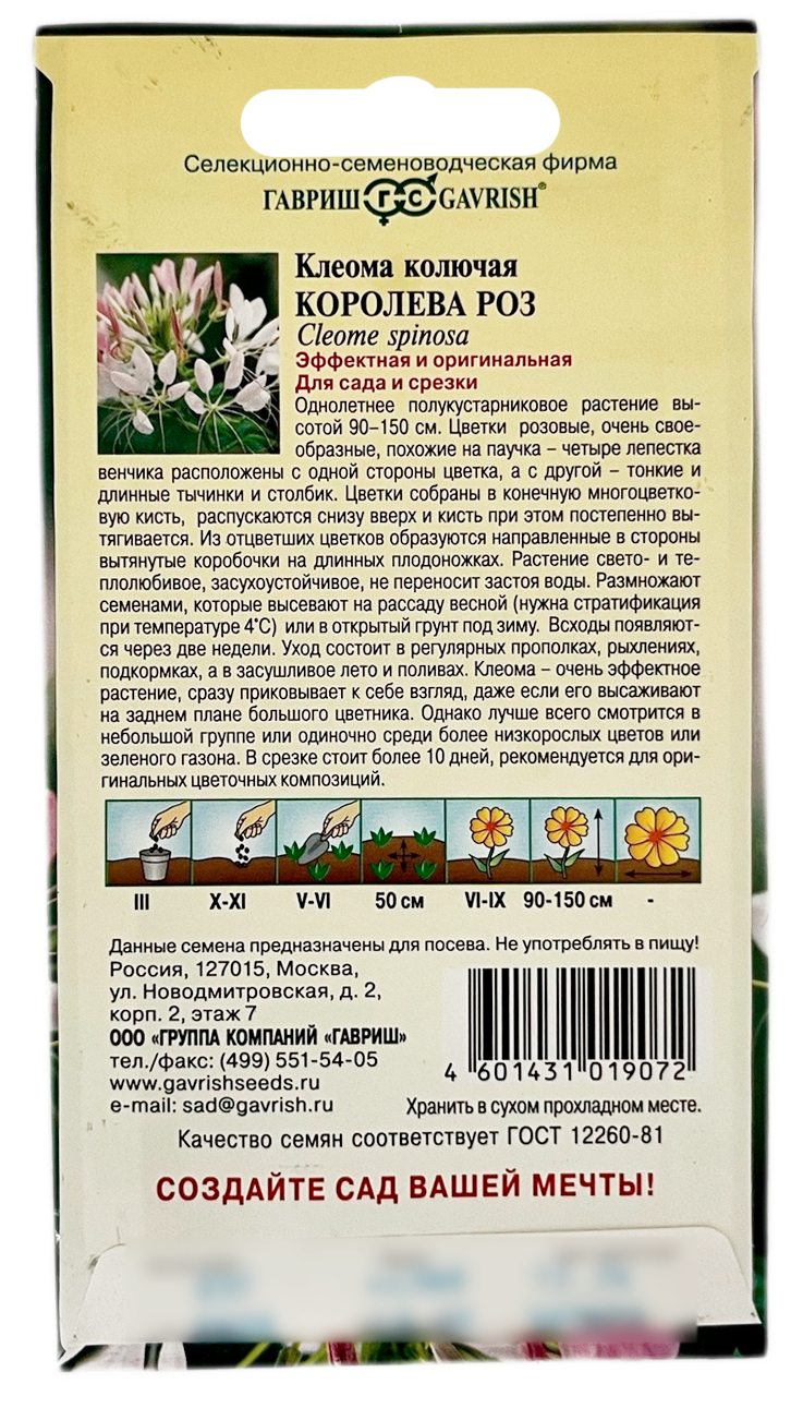 Клеома Королева роз ГАВРИШОднолетнее полукустарниковое растения высотой 90-150 см. Цветки густо-розовая, очень своеобразные, похожие на паучка - четыре лепестка венчика расположены с одной стороны цветка, а с другой - тонкие и длинные тычинки и столбик. Цветки собраны в конечную многоцветковую кисть, распускаются снизу вверх и кисть при этом постепенно вытягивается. Из отцветших цветков образуются направленные в стороны вытянутые коробочки на длинных плодоножках. Растение свето- и теплолюбивое, засухоустойчивое, не переносит застоя воды. Размножают семенами, которые высевают на рассаду весной (нужна стратификация при t 4°C) или в открытый грунт под зиму. Всходы появляются через две недели. Уход состоит в регулярных прополках, рыхлениях, подкормках, а в засушливое лето и поливах. Клеома-очень эффектное растение, сразу приковывает к себе взгляд, даже если его высаживают на заднем плане большого цветника. Однако лучше всего смотрится в небольшой группе или одиночно среди более низкорослых цветов или зеленого газона.