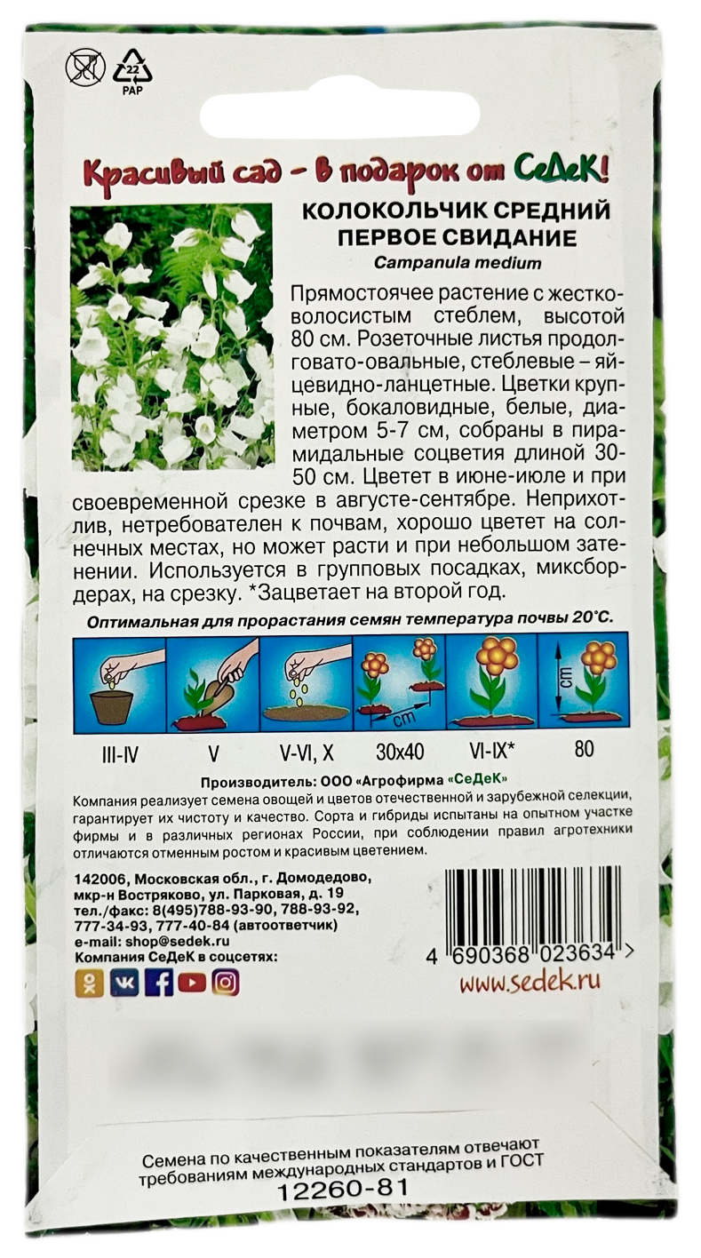 Колокольчик средний ПЕРВОЕ СВИДАНИЕ СеДеКПрямостоячее растение с жестковолосистым стеблем, высотой 80 см. Розеточные листья продолговато-овальные, стеблевые – яйцевидно-ланцетные. Цветки крупные, бокаловидные, белые, диаметром 5-7 см, собраны в пирамидальные соцветия, длиной 30-50 см. Цветет в июне-июле и при своевременной срезке в августе-сентябре. Неприхотлив, не требователен к почвам, хорошо цветет на солнечных местах, но может расти и при небольшом затенении. Используется в групповых посадках, миксбордерах, на срезку. Зацветает на второй год.