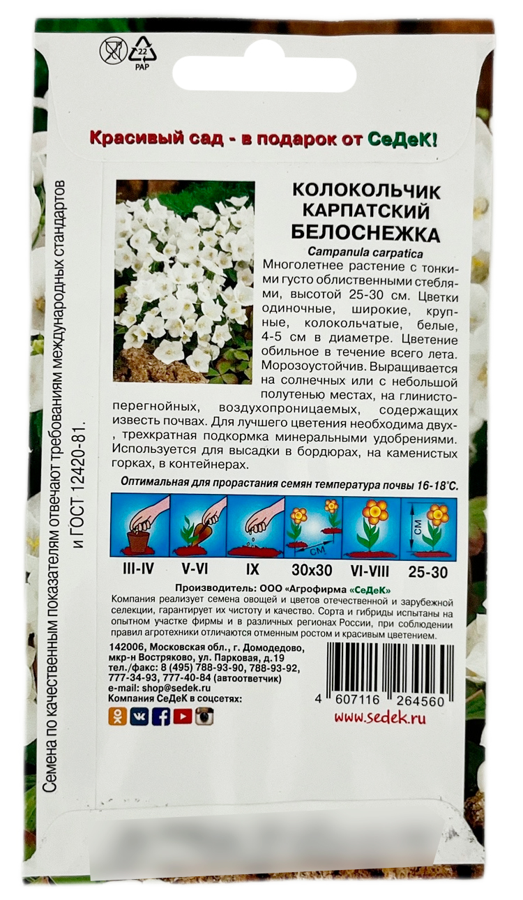 Колокольчик карпатский БЕЛОСНЕЖКА СеДеКМноголетнее растение с тонкими густо облиственными стеблями, высотой 25-30 см. Цветки одиночные, воронковидно-колокольчатые, белые, 4-5 см в диаметре, цветет обильно в течение всего лета. Морозоустойчив. Выращивается на солнечных или с легкой полутенью местах, нуждается в некислой и хорошо дренированной почве. Для лучшего цветения необходима двух-, трехкратная подкормка минеральными удобрениями. Широко используется для высадки в бордюрах и на каменистых горках.