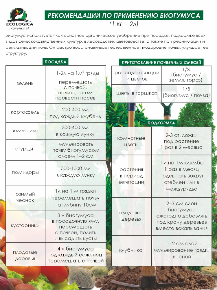 При использовании Биогумуса мы даем гарантию получения экологически чистого урожая. Биогумус совершенно безвреден на любых почвах, и, более того, может использоваться как самостоятельный грунт. Испытания показали, что Биогумус в 10-15 раз эффективнее любых известных органических удобрений. Положительный эффект от него может наблдюдаться до 5 лет.