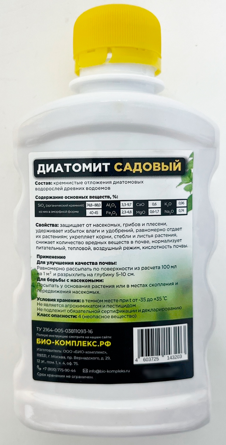 Диатомит садовый - тонкопористые кремнистые породы отложений диатомитовых водорослей, сцементированные опаловым кремнием. Природный почвоулучшитель, инсектицид.Содержание основных веществ, %: SiO2 (органический кремний) - 74,8 – 88,0, из них 40-45 в аморфной форме, Al2O3 - 3,3- 9,7 CaO - 0,6 K2O - 0,96, Fe2O3 - 2,3-4,8 MgO - 0,6-1,7 Na2O - 0,74.