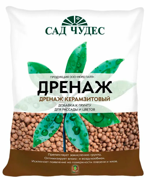 Дренаж керамзит 2л мелк./крупный 4-10/8-20ммФракция 5–40 мм. Срок годности не ограничен. Великолепная добавка к грунтам: улучшает влаго– и воздухообмен грунтов, защищает от закисления и образования плесени, сохраняет полезную почвенную микрофлороструктуру. Используется путем прямого смешивания с грунтом или часть дренажа высыпается на дно цветочного горшка (рассадного ящика) 2–5 см или 5–10 см в зависимости от размера высаживаемого растения, потом засыпается почвогрунтом, а затем опять слой дренажа 2–4 см и снова почвогрунт.