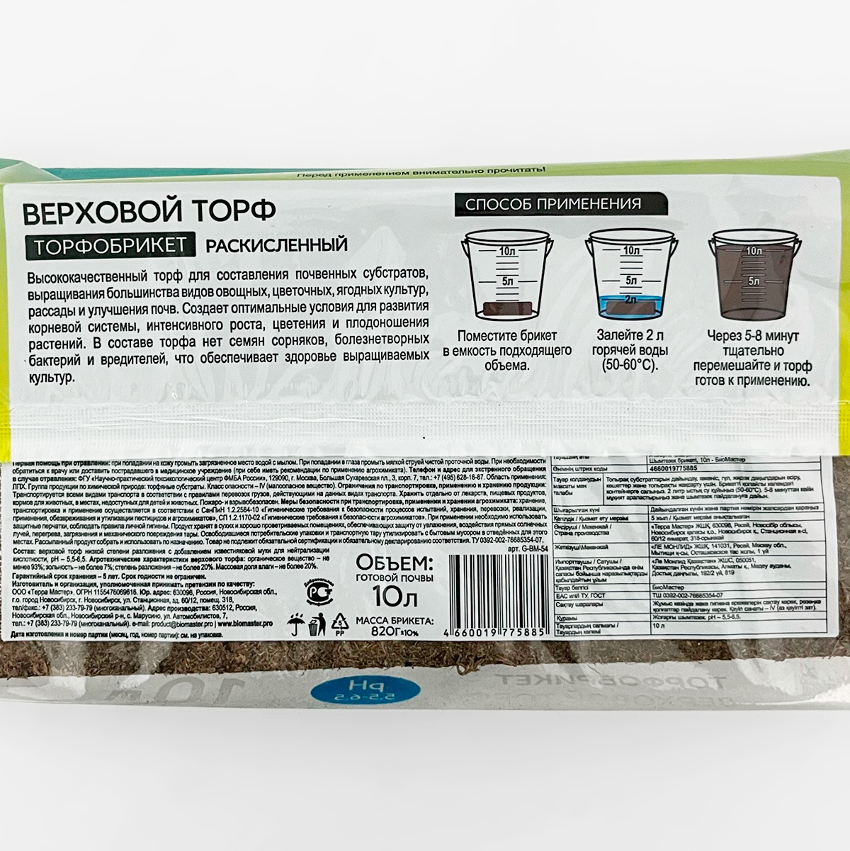 ТОРФОБРИКЕТ раскисленный 10л БИОМАСТЕРВерховой торф, торфобрикет, раскисленный - высококачественный торф для составления почвенных субстратов, выращивания большинства видов овощных, цветочных, ягодных культур, рассады и улучшения почв. Создает оптимальные условия для развития корневой системы, интенсивного роста, цветения и плодоношения растений. В составе торфа нет семян сорняков, болезнетворных бактерий и вредителей, что обеспечивает здоровье выращиваемых культур.