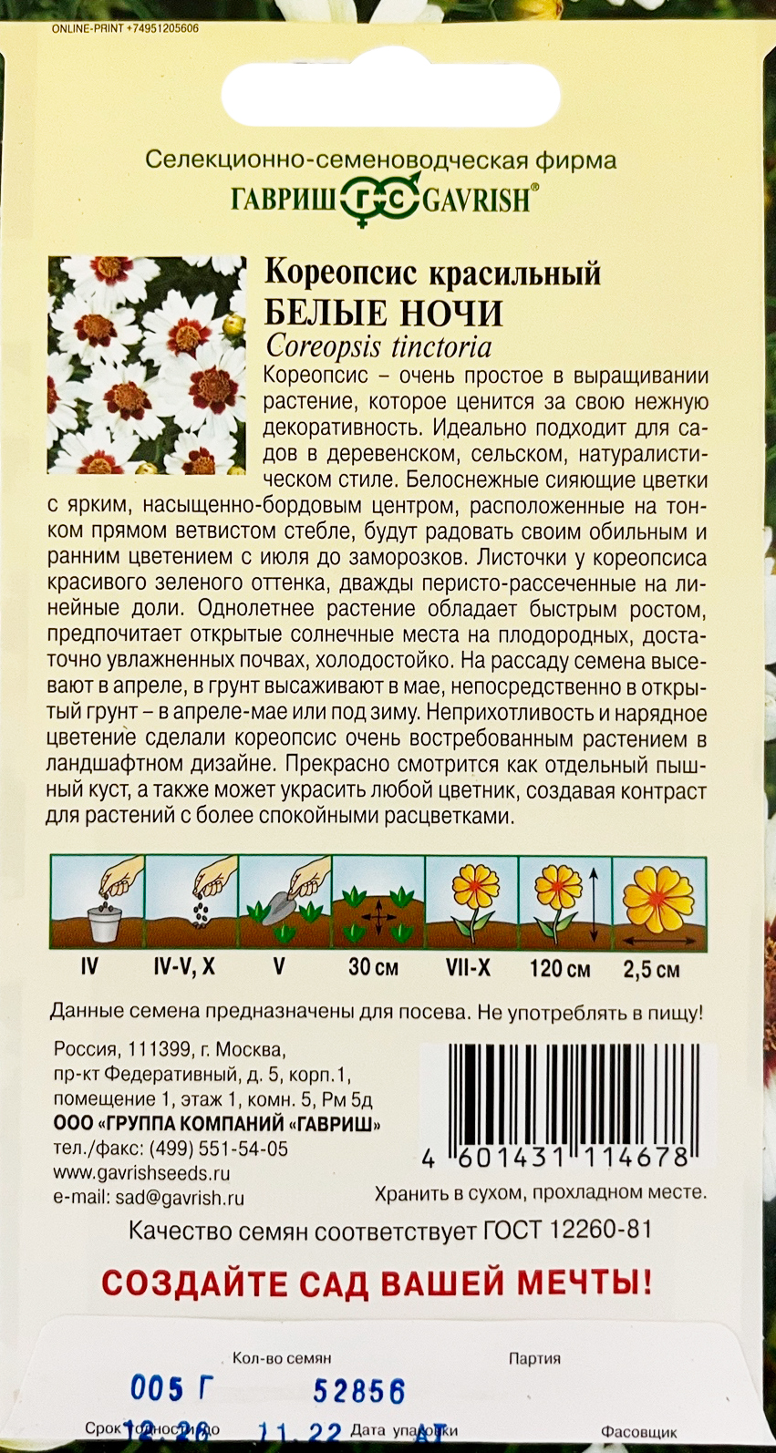 Кореопсис Белые ночи (красильный)* 0,05 г Н22Растение однолетнее с прямым тонким ветвистым стеблем, высотой до 120 см. Листья дважды-перисторассеченные на линейные доли. Соцветия на длинных цветоножках, одиночные, 2,5 см в диаметре. Окраска цветков белая с бордовым центром. Кореопсисы неприхотливы, обладают быстрым ростом, обильным и ранним цветением, предпочитают открытые солнечные места на плодородных, достаточно увлажненных почвах, холодостойки. Посев семян проводят в апреле на рассаду, высадку в грунт — в мае, посев в открытый грунт – в апреле-мае или под зиму. Цветет с июля до заморозков. Используют для оформления сборных цветников, в качестве фоновых растений. В срезке стоят дольше недели.