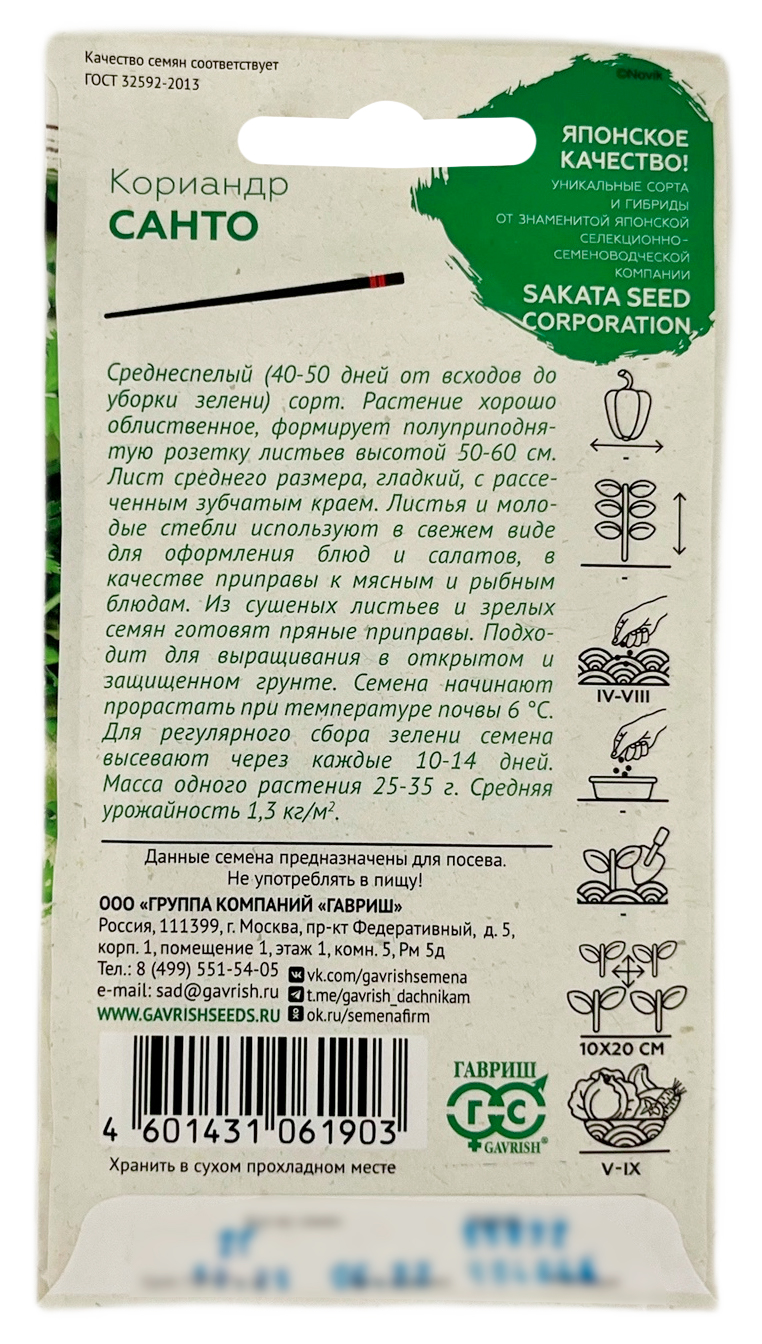 Кориандр САНТО ГАВРИШСреднеспелый (40-50 дней от всходов до уборки зелени) сорт. Растение хорошо облиственное, формирует полуприподнятую розетку листьев высотой 50-60 см. Лист среднего размера, гладкий, с рассеченным зубчатым краем. Листья и молодые стебли используется в свежем виде для оформления блюд и салатов, в качестве приправы к мясным и рыбным блюдам. Из сушеных листьев и зрелых семян приготавливают пряные приправы. Подходит для выращивания в открытом и защищенном грунте. Семена начинают прорастать при температуре почвы 6°С. Для регулярного сбора зелени семена высевают через каждые 10-14 дней. Масса одного растения 25-35 г. Средняя урожайность 1,3 кг/кв.м.
