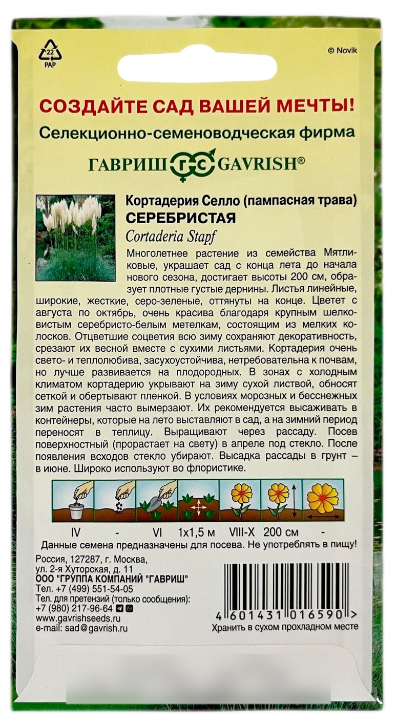 Кортадерия Селло (пампасная трава) СЕРЕБРИСТАЯ ГАВРИШМноголетнее растение из семейства Мятликовые, украшают сад с конца лета и до начала нового сезона, достигают высоты 200 см, образуют плотные густые дернины. Листья линейные, широкие, жесткие, серо-зеленые, оттянутые на конце. Цветет с августа по октябрь, очень красива благодаря крупным шелковистым серебристо-белым метелкам, состоящим из мелких колосков.