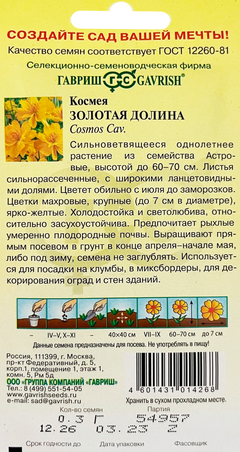 Космея махровая Золотая долинаСильноветвящееся растение из семейства Астровые высотой 100 см. Листья сильнорассеченные с широкими ланцетовидными долями. Цветет обильно с июля до заморозков. Цветки ромашковидные, крупные (10-12 см в диаметре), ярко-желтые. Холодостойка и светолюбива, относительно засухоустойчива. Предпочитает рыхлые, умеренно плодородные почвы. Выращивают прямым посевом в грунт в конце апреля - начале мая, либо под зиму. Используется для посадки на клумбах, в миксбордерах, для декорирования оград и стен зданий.