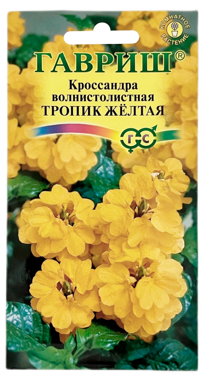 Кроссандра волнистолистная ТРОПИК ЖЕЛТАЯ ГАВРИШЭффектное комнатное многолетнее растение до 25 см высотой семейства Акантовые. Формирует кустик диаметром до 20 см. Стебли прямостоячие, ветвистые. Листья 7-12 см длиной, гладкие, словно лакированные, супротивные или мутовчатые. Цветки ярко-желтые, двугубые, собраны в плотные колосовидные соцветия до 15 см длиной. Цветет продолжительно, с весны до осени. Отцветшие соцветия регулярно обрезают, чтобы цветение возобновлялось. Предпочитает светлое место, защищенное от прямых солнечных лучей.