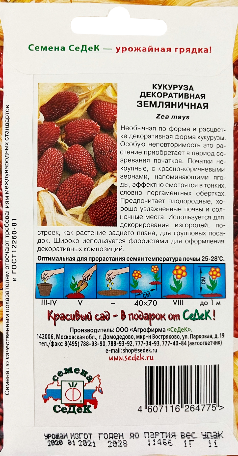 Кукуруза декоративная Амеро, 5шт, Гавриш, Цветочная коллекцияДостигает высоты 1,5-2,0 м. Стебли коленчатые, сочные, покрыты лентовидными пестрыми (с зелеными, желтыми, розовыми и красными) полосами листьями. Эти растения пригодны для создания высоких групп, изгороди, маскировки. Она отлично плодоносит и приятна на вкус в молочной спелости. Уникальность декоративной кукурузы состоит в том, что зерна початков соперничают своей многоцветностью с цветами. Но в отличие от цветов, не увянут, а украсят ваше жилище на годы. Перед посевом семена кукурузы прогревают 4-5 дней на солнце, а затем замачивают в теплой воде, чтобы ускорить появление всходов. Высевают семена в середине мая, когда грунт хорошо прогреется. Глубина заделки семян 5-7 см.