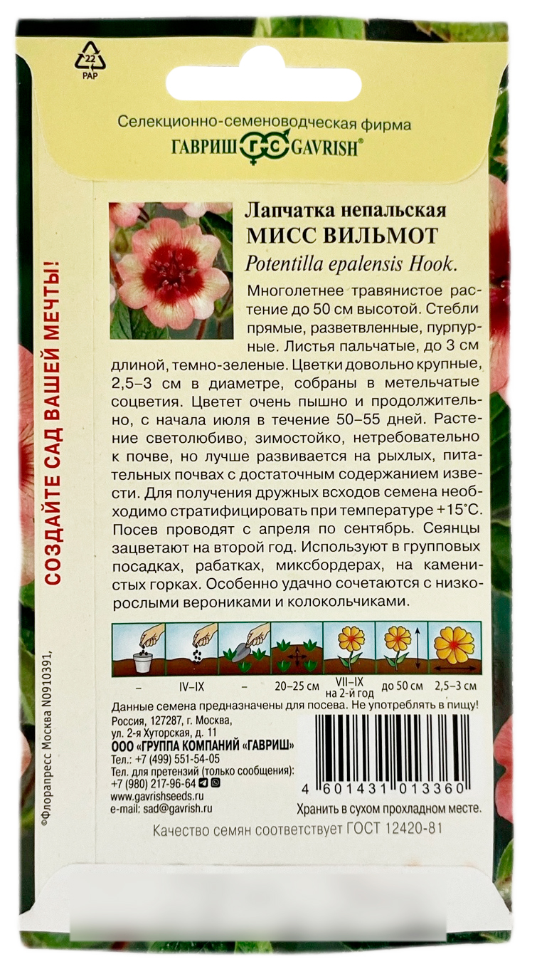 Лапчатка непальская МИСС ВИЛЬМОТ ГАВРИШМноголетнее травянистое растение до 50 см высотой. Стебли прямые, разветвленные, пурпурные. Листья пальчатые, до 30 см длиной, темно-зеленые. Цветки довольно крупные, 2,5-3 см в диаметре, собраны в метельчатые соцветия. Цветет очень пышно и продолжительно, с начала июля в течение 50-55 дней. Растение светолюбиво, зимостойко, нетребовательно к почве, но лучше развивается на рыхлых, питательных почвах с достаточным содержанием извести. Посев проводят с апреля по сентябрь. Сеянцы зацветают на второй год. Используют в групповых посадках, рабатках, миксбордерах, на каменистых горках. Особенно удачно сочетаются с низкорослыми верониками и колокольчиками.