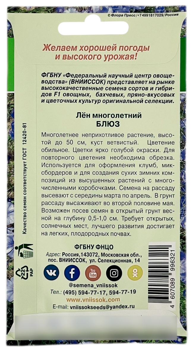 Лён многолетний БЛЮЗ ВНИИССОКМноголетнее неприхотливое растение, высотой до 50 см, куст ветвистый. Цветение обильное. Цветки ярко голубой окраскию Для повторного цветения необходима обрезка. Используется для оформления клумб, миксбордеров и для создания сухих зимних композиций из высушенных растений с многочисленными коробочками. Семена на рассаду высевают с середины марта по апрель. В грунт рассаду высаживают во второй половине мая. Возможен посев семян в открытый грунт весной на глубину 0,5-1,0 см. Требует открытых, солнечных мест, лучшего развития достигает на легких плодородных почавах.