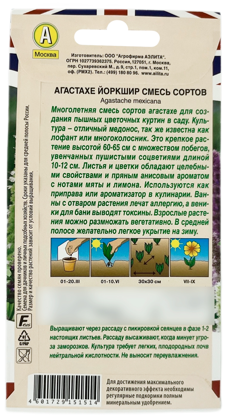 Агастахе йоркшир смесь сортов АЭЛИТАМноголетняя смесь сортов агастахе для создания пышных цветочных куртин в саду. Культура – отличный медонос, также известна как лофант или многоколосник. Это крепкое растение высотой 60-65 см с множеством побегов, увенчанных пушистыми соцветиями длиной 10-12 см. Листья и цветки обладают целебными свойствами и пряным анисовым ароматом с нотами мяты и лимона. Используются как приправа или ароматизатор в кулинарии. Ванны с отваром растения лечат аллергию, а веники для бани выводят токсины. Взрослые растения можно размножать вегетативно. В средней полосе желательно легкое укрытие на зиму.