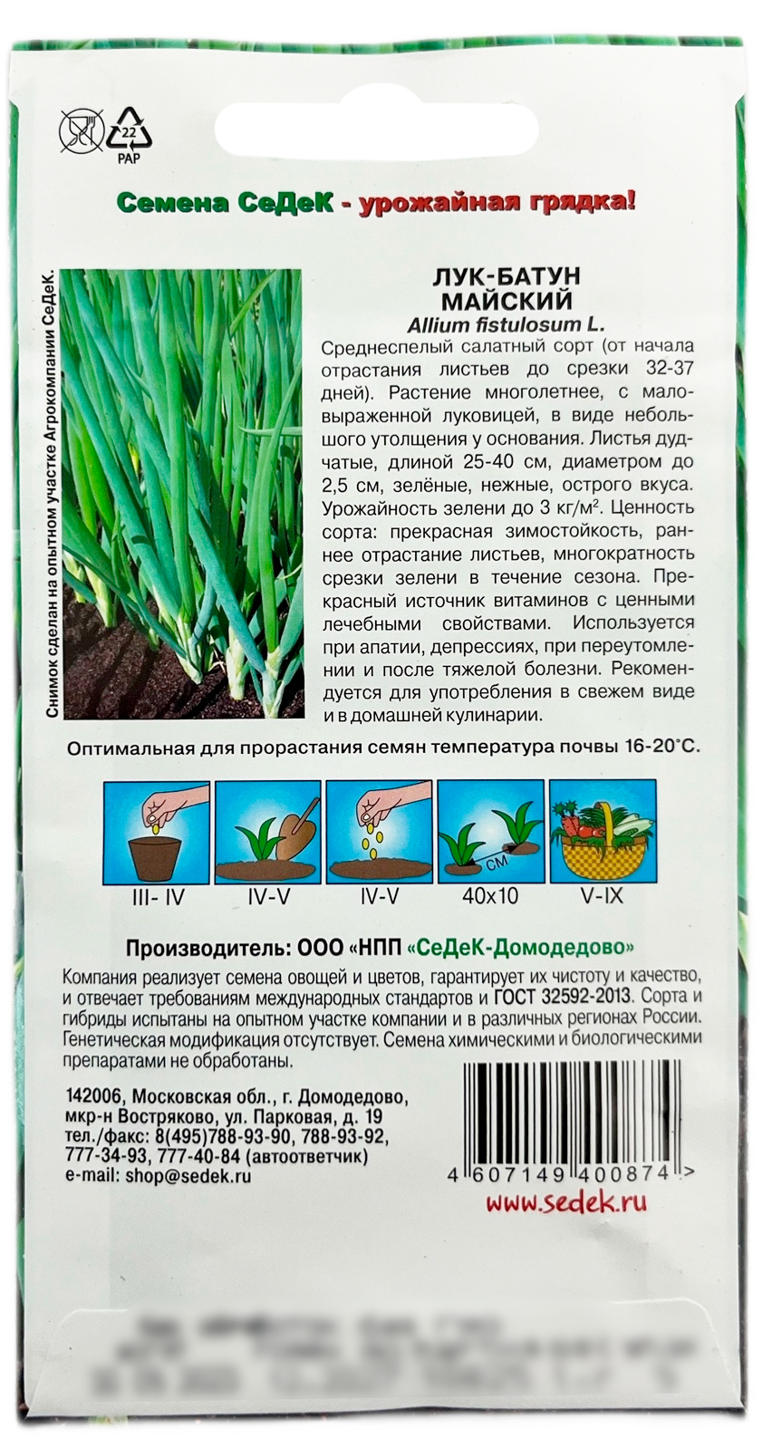 Лук батун МАЙСКИЙ СеДеКСреднеспелый салатный сорт (от начала отрастания листьев до срезки 32-37 дней). Растение многолетнее, с маловыраженной луковицей, в виде небольшого утолщения у основания. Листья дудчатые, длиной 25-40 см, диаметром до 2,5 см, зелёные, нежные, острого вкуса. Урожайность зелени до 3 кг/м2. Ценность сорта: прекрасная зимостойкость, раннее отрастание листьев, многократность срезки зелени в течение сезона. Прекрасный источник витаминов с ценными лечебными свойствами. Используется при апатии, депрессиях, при переутомлении и после тяжелой болезни. Рекомендуется для употребления в свежем виде и в домашней кулинарии.