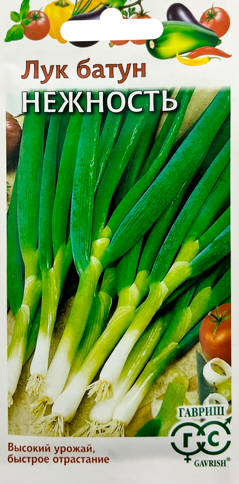 Лук батун НежностьСалатный, среднеспелый зимостойкий сорт салатного назначения, период от начала отрастания листьев до хозяйственной годности - 30 дней. Растение со средней степенью ветвления. Листья длиной до 35 см, зелёные, со слабым восковым налётом, сочные, долго не грубеющие, с нежным слабоострым вкусом. Число листьев на один побег -4. Ценятся за высокую урожайность, раннее получение зеленой продукции, высокую зимостойкость, повышенное содержание в листьях витамина С, каротина, витаминов В1, В2. Масса одного растения 50-60 г. Урожайность 4,2-4,6 кг/кв.м. Возделывается как в однолетней, так и в многолетней культуре. При многолетней культуре посев осуществляют в рядки гнездами по 2-3 семени на глубину 0,5-1,5 см, через каждые 20 см. За лето можно проводить 3-4 срезки зеленого пера. На одном месте выращивают 4-6 лет.