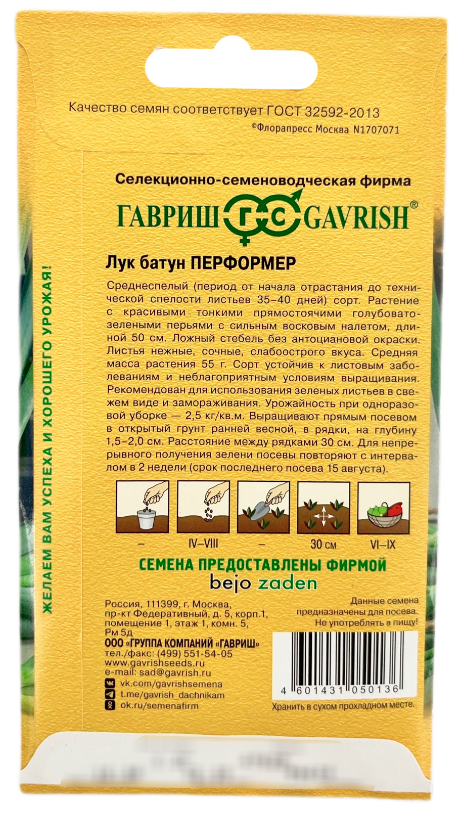 Лук батун ПЕРФОРМЕР ГАВРИШСреднеспелый (период от начала отрастания до технической спелости листьев 35-40 дней) сорт. Растение с красивыми тонкими прямостоячими голубовато-зелеными перьями с сильным восковым налетом, длиной 50 см. Ложный стебель без антоциановой окраски. Листья нежные, сочные, слабоострого вкуса. Средняя масса растения 55 г. Сорт устойчив к листовым заболеваниям и неблагоприятным условиям выращивания. Рекомендован для использования зеленых листьев в свежем виде и замораживания. Урожайность при одноразовой уборке — 2,5 кг/м?. Выращивают прямым посевом в открытый грунт ранней весной, в рядки, на глубину 1,5-2,0 см. Расстояние между рядками 30 см. Для непрерывного получения зелени посевы повторяют с интервалом в 2 недели (срок последнего посева 15 августа).