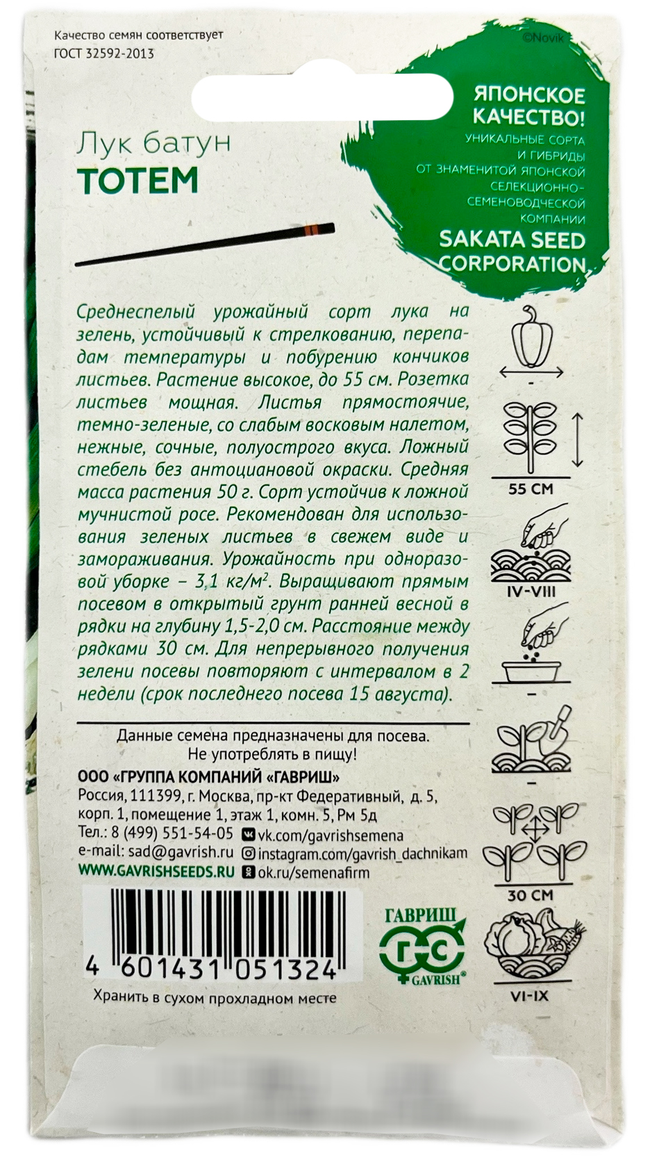 Лук батун ТОТЕМ ГАВРИШСреднеспелый урожайный гибрид лука на зелень устойчивый к стрелкованию, перепадам температур и побурению кончиков листьев. Растение высокое, до 55 см. Розетка листьев мощная. Листья прямостоячие, темно-зеленые, со слабым восковым налетом, нежные, сочные, полуострого вкуса. Ложный стебель без антоциановой окраски. Средняя масса растения 50 г. Гибрид устойчив к ложной мучнистой росе. Рекомендован для использования зеленых листьев в свежем виде и замораживания. Урожайность при одноразовой уборке - 3,1 кг/м?. Выращивают прямым посевом в открытый грунт ранней весной, в рядки, на глубину 1,5-2,0 см. Расстояние между рядками 30 см. Для непрерывного получения зелени посевы повторяют с интервалом в 2 недели (срок последнего посева 15 августа).