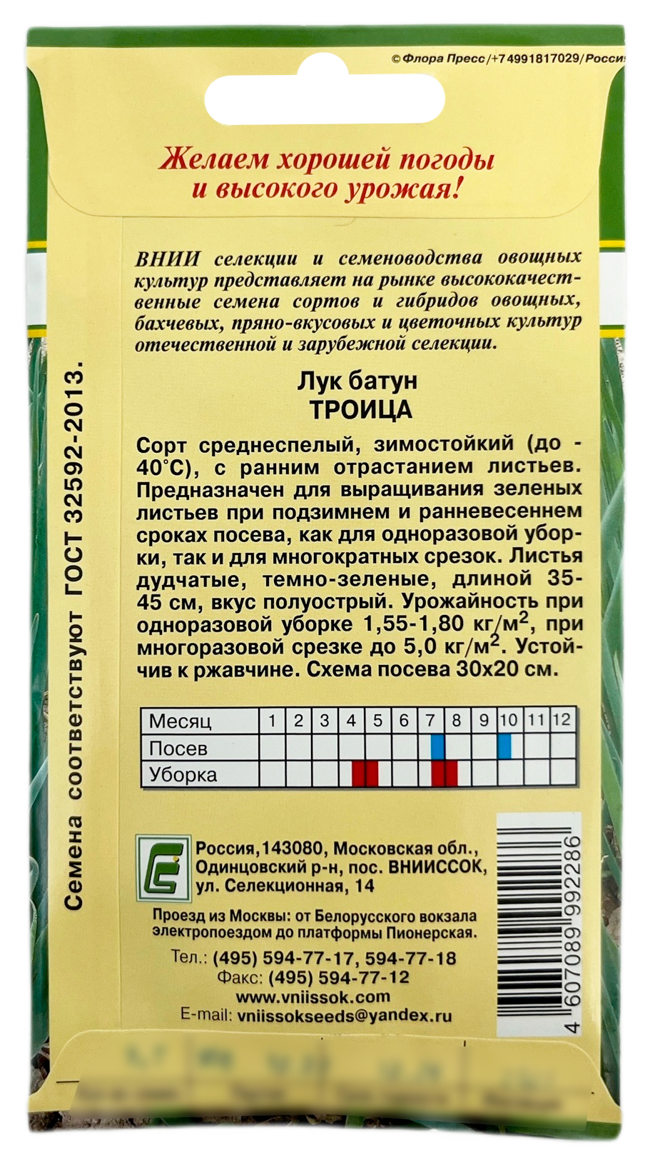 Лук батун ТРОИЦА ВНИИССОКСреднеспелый. Растение высокое. Листья дудчатые, прямостоячие, зеленые с восковым налетом средней интенсивности, длиной до 38 см, шириной 1,7 см. Ложный стебель средней длины, с антоциановой окраской. Листья нежные, полуострого вкуса. Средняя масса растения 15 г. Урожайность 1,8 кг/кв.м. Сорт зимостойкий.