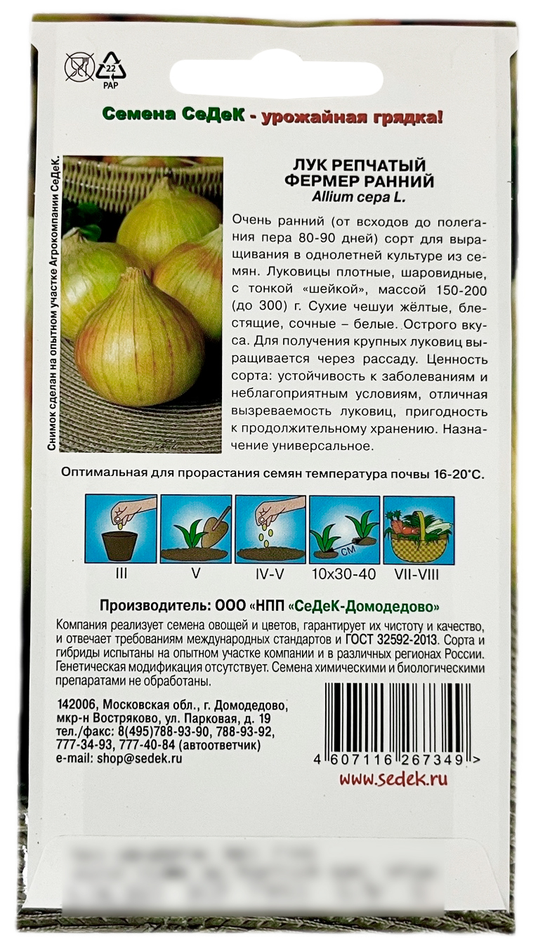 Лук репчатый ФЕРМЕР РАННИЙ СеДеКОчень ранний (от всходов до полегания пера 80-90 дней) сорт для выращивания в однолетней культуре из семян. Луковицы плотные, шаровидные, с тонкой «шейкой», массой 150-200 (до 300) г. Сухие чешуи жёлтые, блестящие, сочные – белые. Острого вкуса. Для получения крупных луковиц выращивается через рассаду. Ценность сорта: устойчивость к заболеваниям и неблагоприятным условиям, отличная вызреваемость луковиц, пригодность к продолжительному хранению. Назначение универсальное.